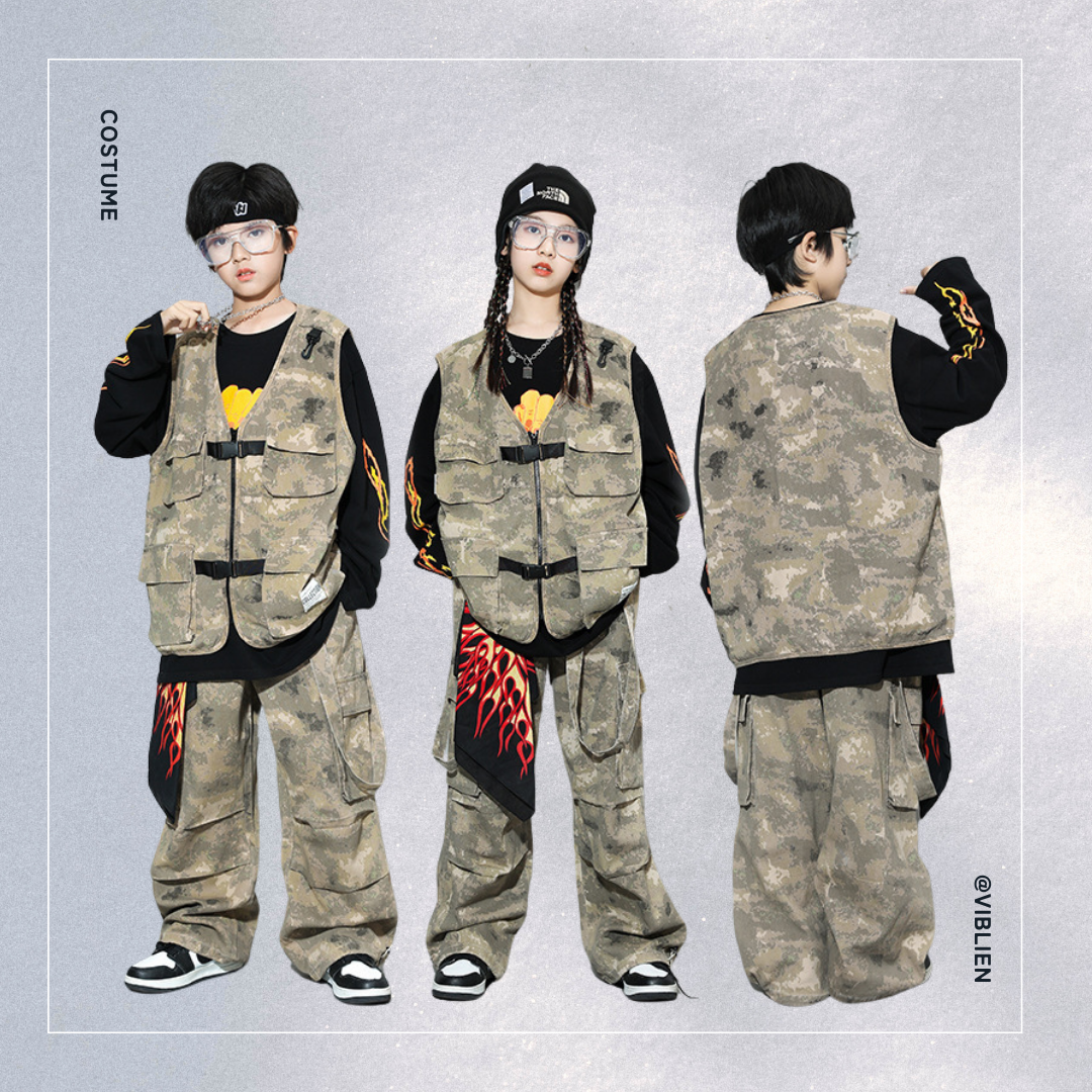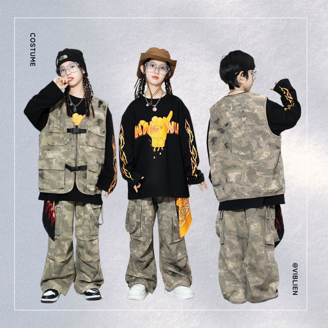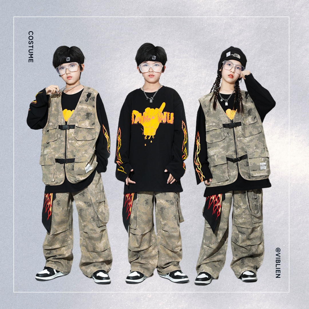 🟢 迷彩×炎デザイン ストリート系ダンスコスチューム 🔥👟