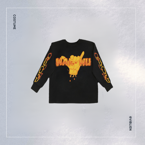 🧥 トップス:黒の長袖シャツに炎のプリントがインパクト抜群🔥