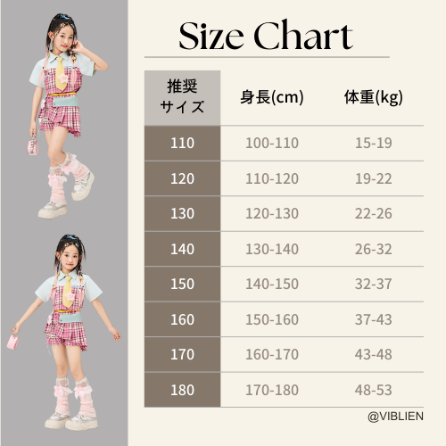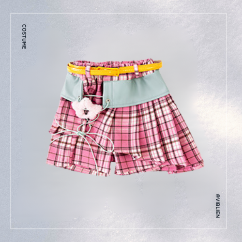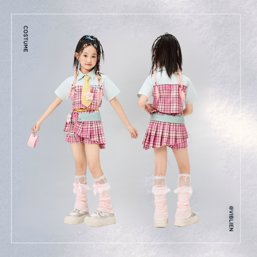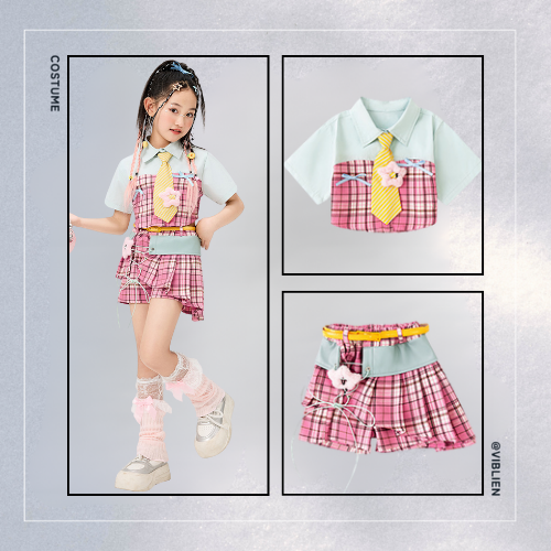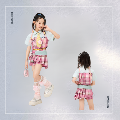 ピンクのチェック柄が目を引く、ガールズ向けスクール風ダンス衣装セット。