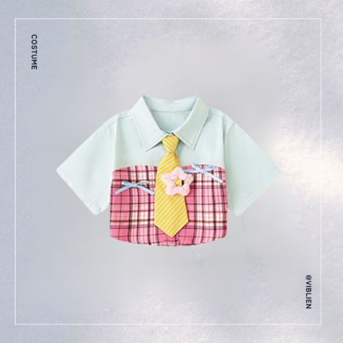 ネクタイやサスペンダー風デザインがアクセントになり、ガーリーでポップな世界観を演出。
