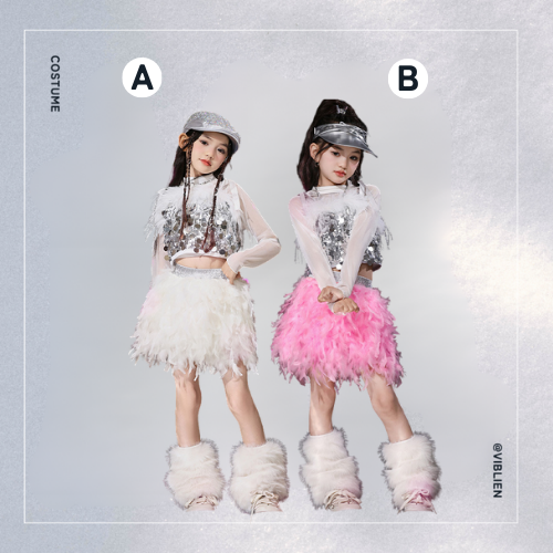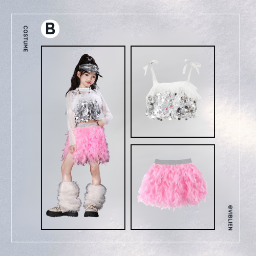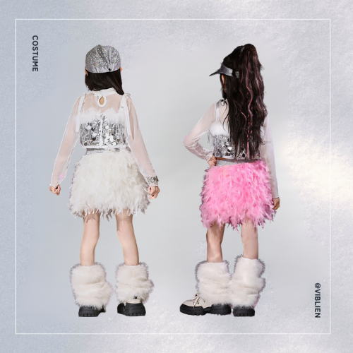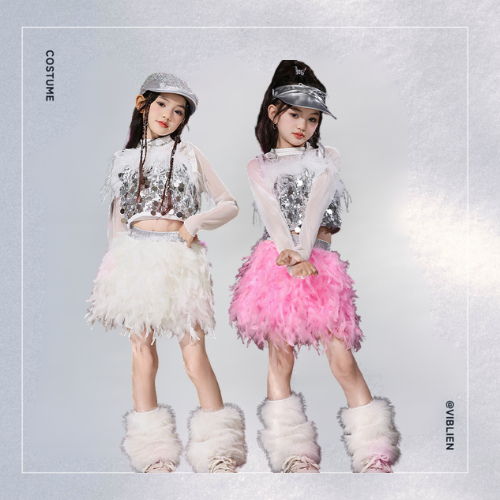 ステージ映え間違いなしの、フェザー×グリッターを組み合わせたゴージャスなダンス衣装セット。