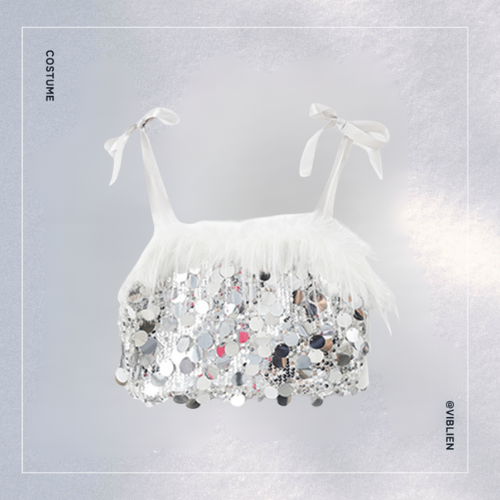 軽やかに揺れるフェザースカートと、上品に輝くシルバートップスのコントラストは、見る人の視線を一気に惹きつけます。
