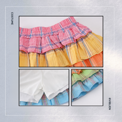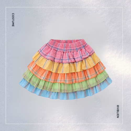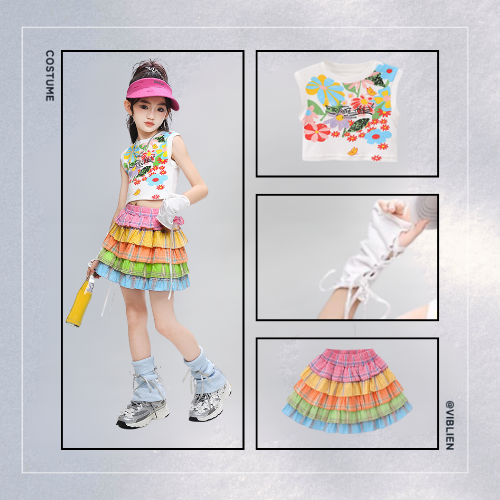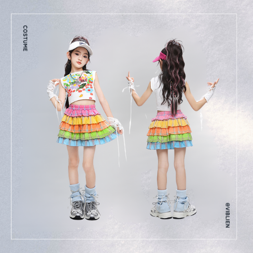 カラフルなレインボーフリルスカートが視線を集める、ポップで元気いっぱいのダンス衣装セット。