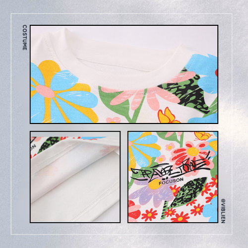 トップスは白ベースにカラフルなデザインを組み合わせ、明るくPOPな印象に。
