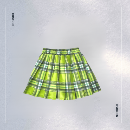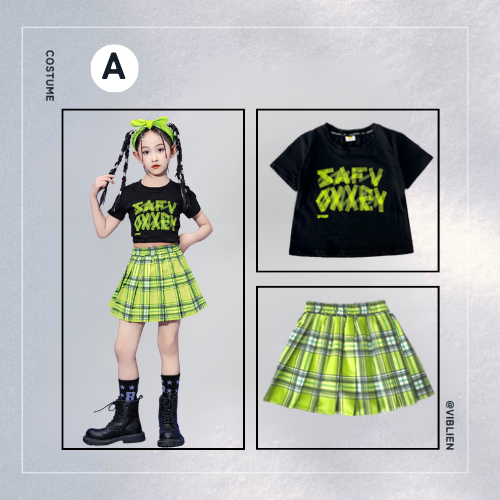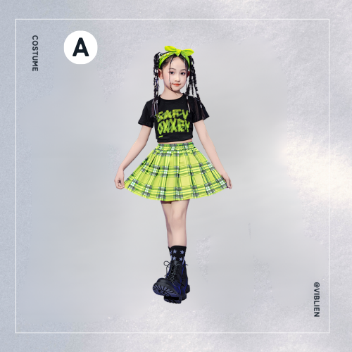 ネオンイエローのチェック柄スカートが存在感たっぷりで、ポップ・K-POPダンスに最適。