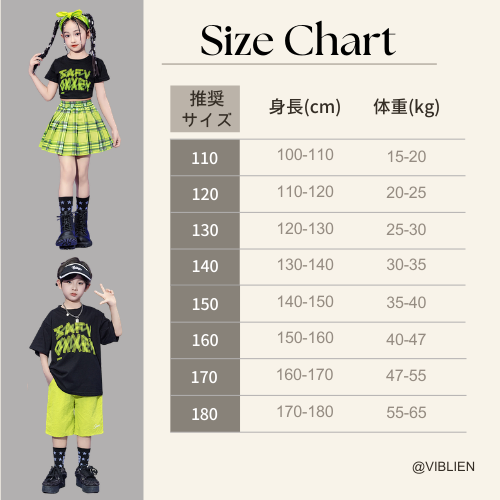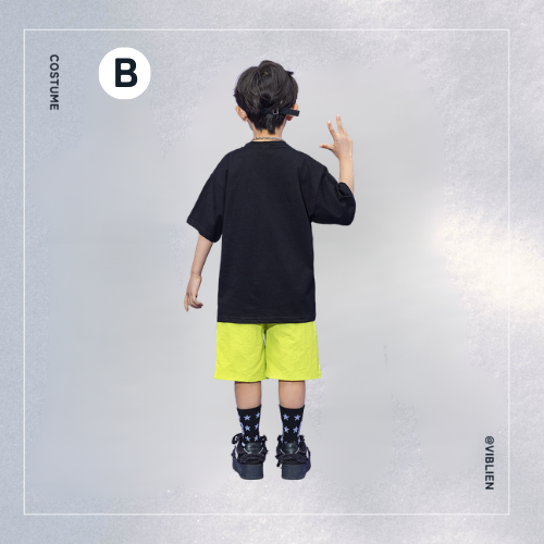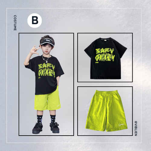 ネオンイエローとブラックのコントラストが目を引く、POPでストリート感あふれるキッズダンス衣装シリーズ。