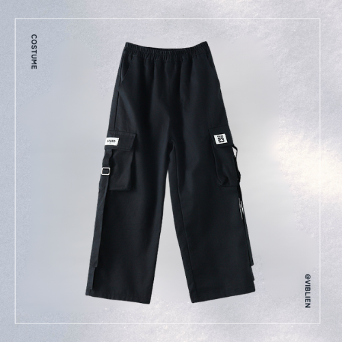 トップスのカットデザインが動きをシャープに見せ、ワイドカーゴパンツのシルエットがストリート感を一段と引き立てます。