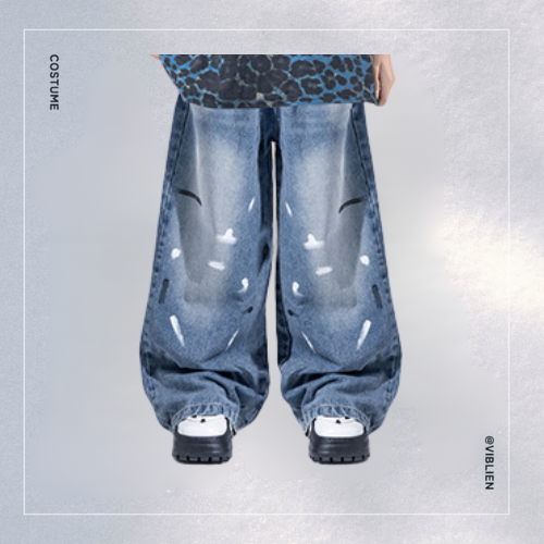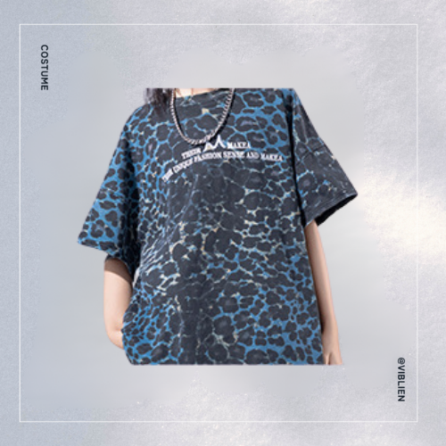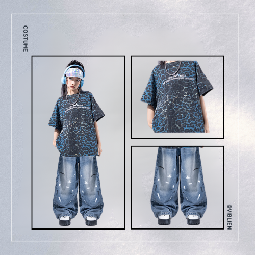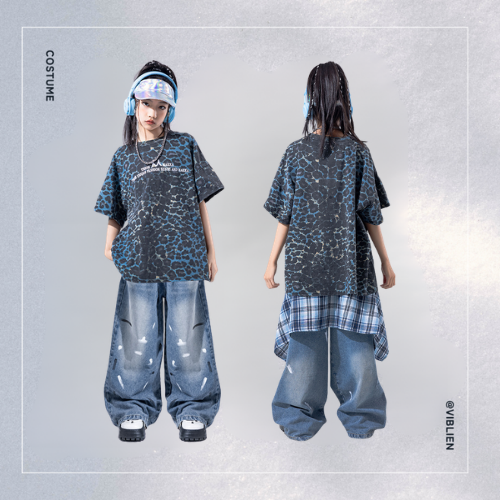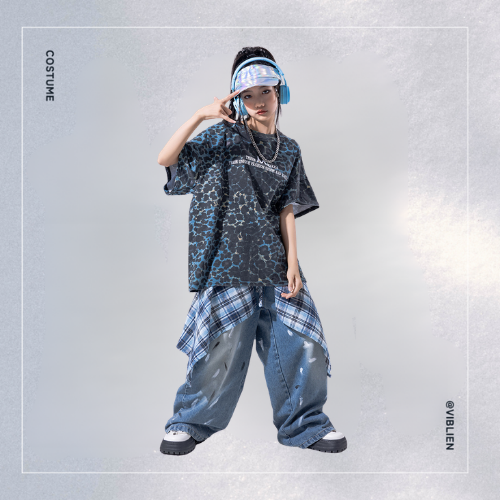 ダークトーンのアニマル柄トップスと、レイヤードデニムを組み合わせた個性派ストリートコーデ。